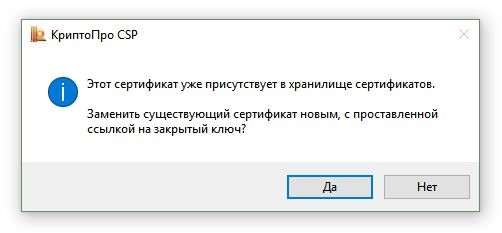 10. Если откроется сообщение «Этот сертификат уже присутствует в хранилище сертификатов. Заменить существующий сертификат новым, с проставленной ссылкой на закрытый ключ?», нажмите Да: