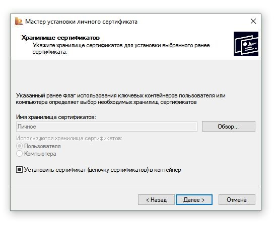 7. В следующем окне отметьте пункт Установить сертификат (цепочку сертификатов) в контейнер и нажмите Далее: