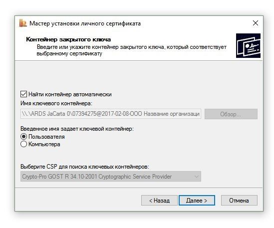 6. Поставьте галку в окне Найти контейнер автоматически (в нашем примере контейнер находится на смарт-карте JaCarta) и нажмите Далее: