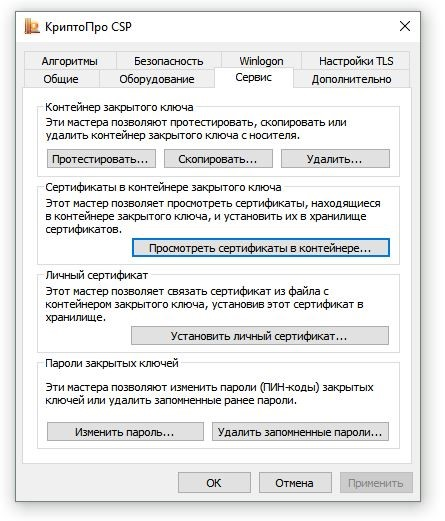2. В окне программы КриптоПро CSP перейдите на вкладку Сервис и нажмите кнопку Просмотреть сертификаты в контейнере: