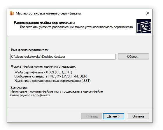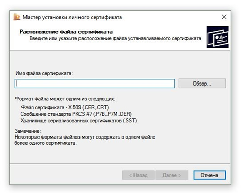Для установки сертификата этим способом Вам понадобится файл сертификата (файл с расширением.cer). Он может находиться, например, на съемном носителе или на жёстком диске компьютера (если Вы делали копию сертификата или Вам присылали его по электронной почте).