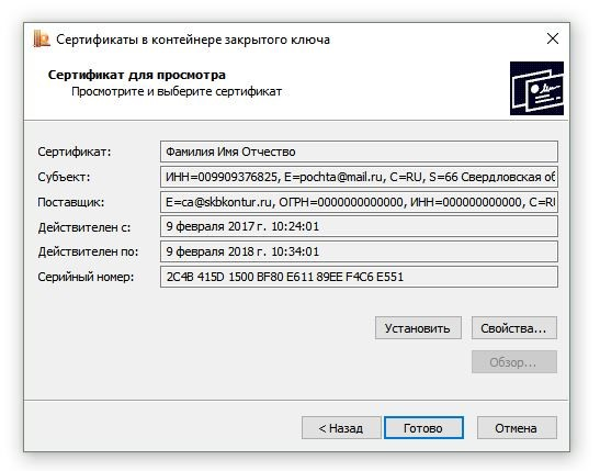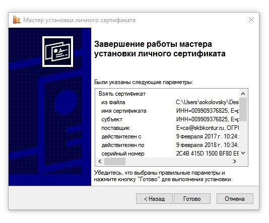 8. В окне Завершение мастера установки личного сертификата нажмите Готово: