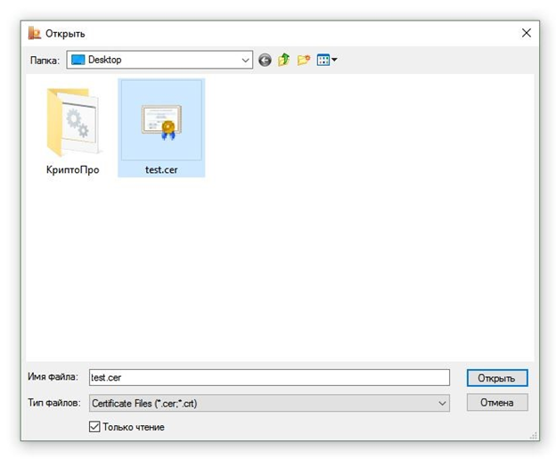 4. Укажите путь к файлу сертификата и нажмите кнопку Открыть (в нашем примере файл сертификата находится на Рабочем столе):