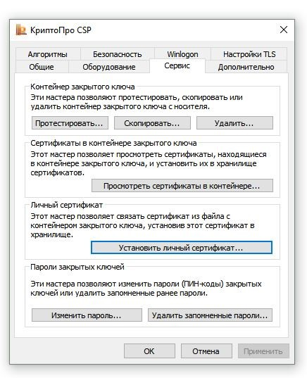 2. В окне программы КриптоПро CSP перейдите на вкладку Сервис и нажмите кнопку Установить личный сертификат: