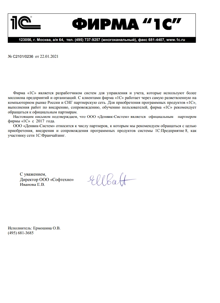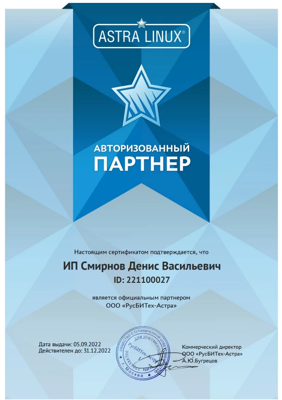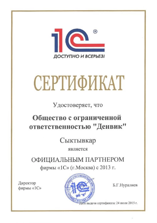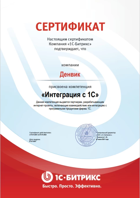Сертификат подтверждает, что компания Денвик является Бизнес-партнером компании 1С-Битрикс